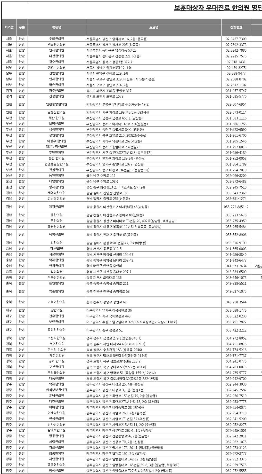 특히 광주 지역은 거의 모든 한의원이 보훈대상자 우대진료에 참여하고 있어, 지역별로 혜택의 폭이 다를 수 있습니다. 반면, 서울이나 부산 등 대도시는 참여 한의원이 상대적으로 적은 편입니다.